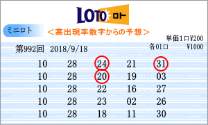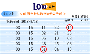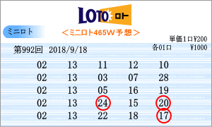 | 9月18日の運命数は「2」と「3」の2つです。該当数字は、「02」・「12」・「22」・「03」・「13」・「23」の6個です。出現チャートからの注意数字は、「02」・「03」・「10」・「11」・「12」・「13」・「15」・「16」・「23」・「25」・「31」となりました。運命数は「22」以外は注意数字に入ってきています。分布表からの出現状況から見て、ベスト数字4位の「02」とワースト数字2位の「13」を選びました。「02・13」は465組の中では過去41回出現の7位に相当するコンビです。 |