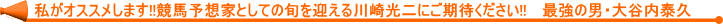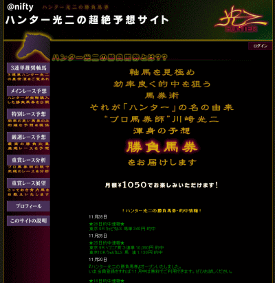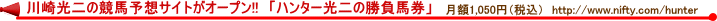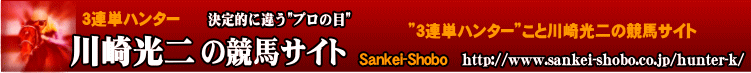 | ・長らくご愛顧いただきました「川崎光二の競馬サイト」ですが、06年11月30日をもちまして終了いたしました・ 今後は、川崎光二が提供する競馬予想サイト「ハンター光二の勝負馬券」をご利用ください |