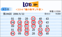「ロト6でビリオネア!!」 <第296回抽せんで惜しい的中!!!> ![]() あと一つで2等的中!! 「魔の数字」がズバリ的中!! <第266回抽せんで大的中!!!> ![]() 4等2本!!5等3本大的中!! (画像をクリックすると予想が見れます) |