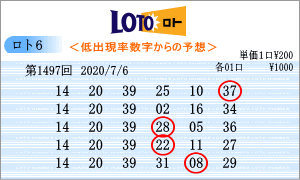 | 7月6日の第1497回です。九星は五黄で、六曜は友引です。「五黄・友引」の組み合わせによる抽せん回は21回目。前回は2013年2月の733回。五黄と友引のパターン表を見ると最多出現回数は「13」の8回。五黄の五黄殺数字は「5」で、「05」が3回、「15」が1回、「25」が4回、「35」が5回です。前回の抽せん数字からは「13」・「16」・「34」・「37」が重複数字に入ってきました。久しぶりの組み合わせ回数の割りには出現力シートが整いました。 |