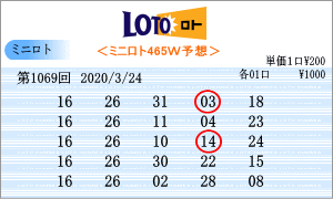 | 3月24日の第1069回を狙う予測数字は、斜線成立数字の中から「01」・「04」・「06」・「10」・「12」・「15」・「16」・「18」・「20」・「21」・「23」・「24」・「26」・「28」・「30」となりました。1068回からの連続数字は、「20」と「24」を軸数字に。高確率数字は「10」と「28」を軸数字に。低確率数字は、「01」と「04」を軸数字に選びました。それぞれ5口の買い目はミニロトパーフェクトデータからの相性数字で組み立てました。今回同じ段数で斜線が交差した数字は「01」・「18」・「20」。5口の買い目はミニロトパーフェクトデータの最新相性数字より組み立てました。 |