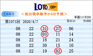 | 4月7日第1071回の運命数は「8」・「3」の2つです。該当数字は、「08」・「18」・「28」・「03」・「13」・「23」の6個です。チャートから見た注意数字は、「02」・「07」・「08」・「10」・「12」・「15」・「18」・「20」・「22」・「23」・「28」。1071回の軸数字候補は「08」・「28」・「23」。この中から「28」と「23」を選びました。買い目はミニロトパーフェクトデータの最新相性数字からの5組です。 |
