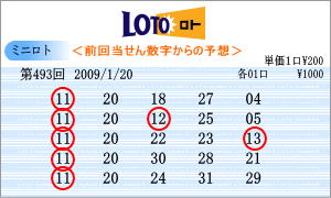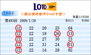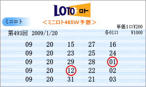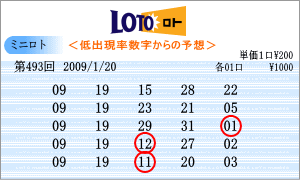 | 1月20日の運命数は「6」・「2」・「9」で、06・16・26・02・12・22・09・19・29 が対象数字となります。出現チャートからの注意数字は、08・09・11・20・22です。「20」は連続数字でもあり、「09」はチャートと運命数が一致したので軸数字として選択しました。軸数字からの買い目は「ミニロトパーフェクトデータVOL2」から組みました。 |