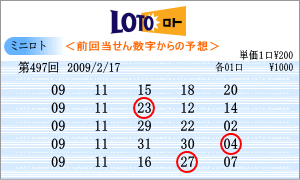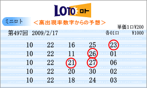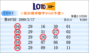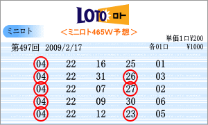 | 2月17日の運命数は「4」と「5」ですので、対象数字は、04・14・24・05・15・25 となります。出現チャートの斜線からは、04・11・22・28が注意数字です。496回の本数字も検討に加え、497回を狙う軸数字は「04」と「22」にしました。 |