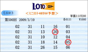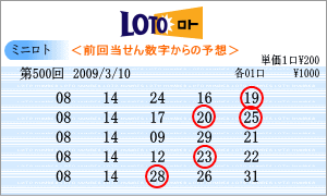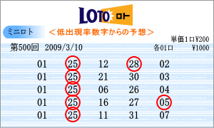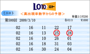 | 記念すべき500回目の抽せんです。今回の出現予測範囲は、01・02・03・07・08・13・14・15・16・25・26・30・31 となりました。勢いのある「26」・「03」が入ってきました。連続候補は、「08」と「14」を選びました。高確率は、105回でベスト5位の「02」と111回でベスト2位の「16」を軸数字に。低確率はワースト3位の「01」とワースト4位の「25」を軸数字にしました。 |