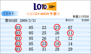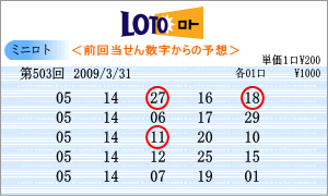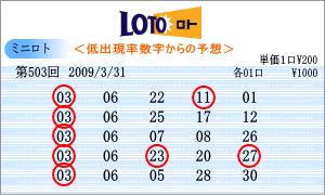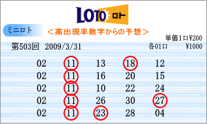 | 503回の出現予測範囲は番号の若い数字が多くなりました。02・03・04・05・05・06・11・12・13・14・15・21・22 などです。連続候補は「05」と14」。高確率は119回出現の「11」と106回の「02」。低確率は77回の「03」と94回の「06」をそれぞれ軸数字にしました。軸数字に絡む3つの数字は、「ミニロトパーフェクトデータ VOL2」より組み立てました。 |