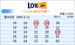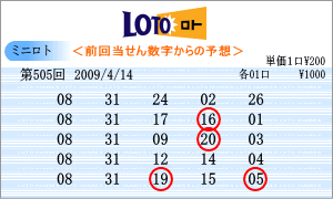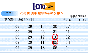 | 4月14日の運命数は「3」・「6」・「0」で、対象数字は03・13・23・06・16・26・10・20・30 となります。出現チャートからの注意数字は、09・10・24・28・31 などです。ここから505回を狙う軸数字を、「10」・「24」としました。 |