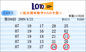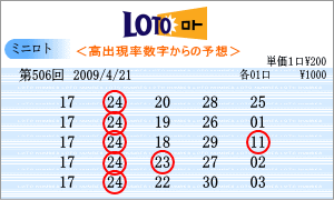| 出現予測範囲を見る場合、本数字の連続候補をまず検討します。ところがここ何回か本数字が連続していません。505回を狙う数字は、「05」・「06」・「07」・08」・「15」・「16」・「17」・「19」・「20」・「21」・「24」・「25」・「26」となりました。この中から連続数字候補は、「16」と「20」。高確率は「17」と「24」。低確率は「07」と「19」をそれぞれ軸数字にしました。 |