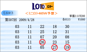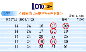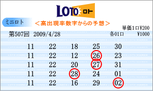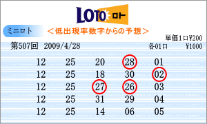 | 505回から506回へ連続数字がなかったのですが、なんか最近の傾向かなと感じています。それでも基本どうりまず、連続候補を調べます。507回は「14」と「24」を連続数字としてみました。03・04・05・10・11・12・14・15・22・23・24・25 が今回の出現予測範囲です。高確率は、「11」と「22」。低確率は、「12」と「25」を軸数字に選びました。 |