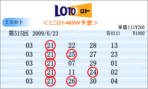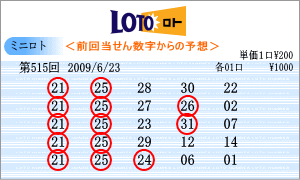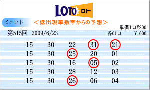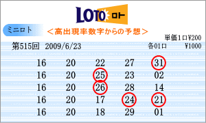 | 515回の出現予測範囲は、「03」・「14」・「15」・「16」・「20」・「21」・「24」・「25」・「26」・「30」・「31」となりました。この中から、まず連続数字候補を探すと、「21」と「25」が浮上しました。高確率は、「16」と「20」。低確率は、「15」と「30」を軸数字として選びました。 | |||||||
