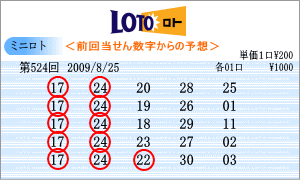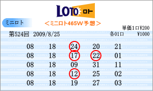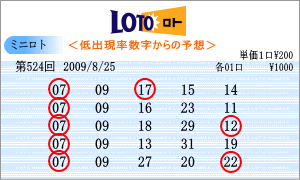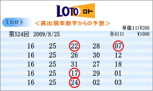 | 524回の出現予測範囲は、「07」・「08」・「09」・「16」・「17」・「18」・「19」・「20」・「23」・「24」・「25」となりました。この中から、連続候補は「17」と「24」を選びました。高確率は、直近20回で8回出現1位数字の「25」とべスト2位の「16」を軸にしました。低確率は、ワースト1位の「09」と3位の「07」を軸としました。5口の組み合わせは「ミニロトパーフェクトデータ」から抽出しました。 | |||||||