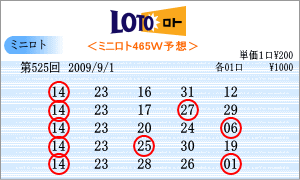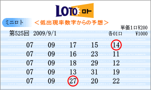 | 9月1日の運命数は、「4」と「3」。対象数字は、「04」・「14」・「24」・「03」・「13」・「23」。出現チャートの斜線からは、「07」・「10」・「12」・「17」・「18」・「22」・「23」・「24」が注意数字としてあがってきました。「24」を選びたいところですが、運命数の「23」と「14」を軸数字として選びました。 |