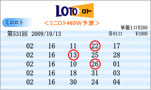 | 10月13日の運命数は「2」と「5」です。対象となる数字は「02」・「12」・「22」・「05」・「15」・「25」となります。「5」は先週も運命数でしたね。出現チャートからの注意数字は、「02」・「10」・「16」・「18」・「19」・「27」・「29」などです。ここから今回の軸数字は、「02」と「16」を選びました。 |