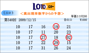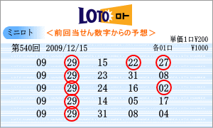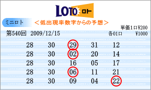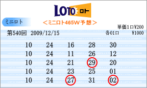 | 12月15日の運命数は、「4」と「2」です。対象となる数字は、「04」・「14」・「24」・「02」・「12」・「22」です。出現チャートの斜線では、「09」と「29」に左からも右からも重なるのですが、この2つの数字はワースト1位の数字で過去連続していないのです。注意数字は「10」・「07」・「24」・「09」・「29」となりました。この中から今回は、「10」と「24」を軸数字としました。買い目は「ミニロトパーフェクトデータ」から組ました。 |