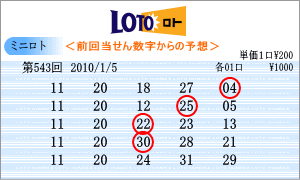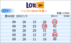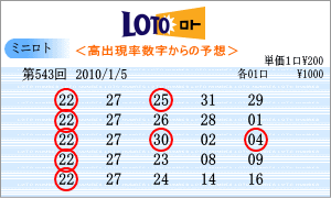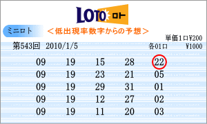 | 2010年の1回目となる1月5日は、運命数が「5」・「9」・「6」の3つです。対象数字は、「05」・「15」・「25」・「09」・「19」・「29」・「06」・「16」・「26」です。出現チャートからの注意数字は、左右の斜線が交差した「09」・「11」・「20」・「27」・「26」それに斜線の流れから「06」がなどがチェックです。今回の軸数字は、運命数と注意数字から「09」と「26」を選びました。5口の買い目は「ミニロトパーフェクトデータ」からの組み合わせです。 |