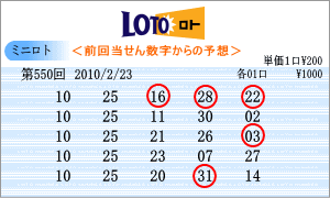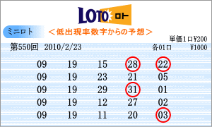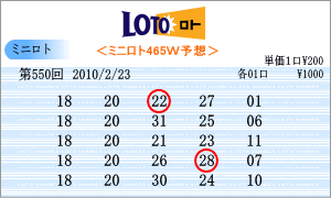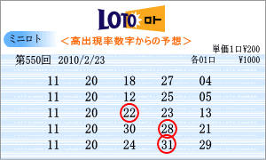 | 2月23日の運命数は、「9」・「6」・「8」・「0」と4つあります。対象となる数字は、「09」・「19」・「29」・「06」・「16」・「26」・「08」・「18」・「28」・「10」・「20」・「30」となります。出現チャートからの注意数字は、「10」・「18」・「19」・「20」・「24」・「25」などです。連続しそうな数字として「10」も考えましたが、今回は「18」と「20」を軸数字としました。買い目は「ミニロトパーフェクトデータ VOL2」から組み立てています。 |