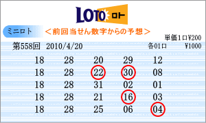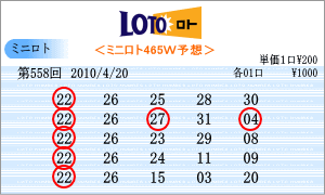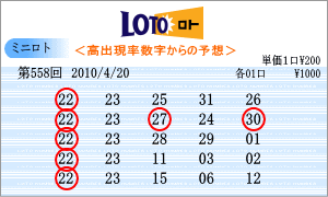 | 4月20日は「6」と「5」が運命数です。対象となる数字は、「06」・「16」・「26」・「05」・「15」・「25」の6つの数字です。出現チャートからの注意数字は、「08」・「09」・「18」・「19」・「22」・「23」・「27」・「28」・「31」と多めですが出てきました。この中から軸となる数字は「22」と「26」を選びました。 |