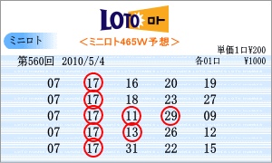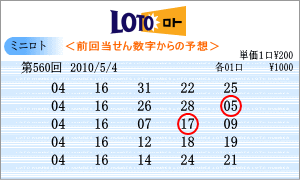 | 5月4日の運命数は「8」と「7」です。「08」・「18」・「28」・「07」・「17」・「27」が対象となる数字です。出現チャートからの注意数字は、「02」・「07」・「08」・「17」などです。「04」と「16」が3回連続出現するかという抽せん回ですが、今回は数字的に入ってきませんでした。軸数字は、「07」と「17」で狙いました。 |