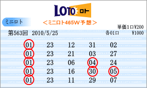 | 結果を出現チャートに書き込んでみると、注意数字が「01」・「02」・「07」・「11」・「14」・「15」・「23」となりました。5月25日の運命数は、「1」と「3」ですので、「01」・「11」・「21」・「31」・「03」・「13」・「23」です。今回の軸数字はこれらの数字をチャートと照合して、「01」と「23」としました。 |