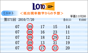 | 7月20日の運命数は「3」と「4」です。「03」・「13」・「23」・「04」・「14」・「24」が対象となる数字です。出現チャートからの注意数字は、「03」・「05」・「06」・「09」・「10」・「11」と前半の数字に集中してしまいました。結果表を見ながら、ここに出現したらきれいな斜線が出来上がるという逆の発想でみるのもヒントになりました。今回は「04」と「13」が軸数字です。 |