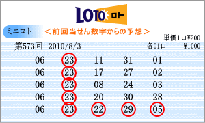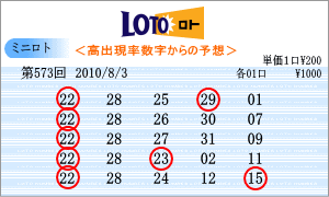 | 8月最初のミニロトです。予測範囲の数字は、「05」・「06」・「07」・「18」・「19」・「22」・「23」・「24」・「28」・「29」・「30」となりました。分布図の斜線は何組もでませんでした。その中から連続候補は、「06」と「23」をピックアップしました。高確率は、ベスト数字5位の「22」と直近1位の「28」を軸数字に選びました。低確率は、ワースト数字3位の「07」と4位の「29」です。「29」はワースト数字とはいえない活躍をしています。 |