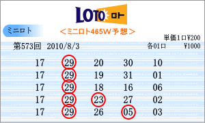 | 8月3日の運命数は、「7」・「5」・「9」です。「07」・「17」・「27」・「05」・「15」・「25」・「09」・「19」・「29」が対象となる数字です。出現チャートからの注意数字は、「06」・「07」・「17」・「23」・「24」・「29」・「30」です。運命数と一致する「17」と「29」を軸数字としました。5口の買い目はミニロトパーフェクトデータVOL2から組み立てました。 |