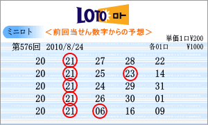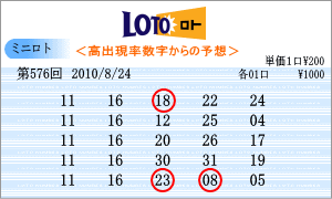 | 分布図を見ると、ボーナス数字が574回に「25」・575回で「24」と斜めにつながりました。珍しい傾向の中、予測範囲をチェックしました。「10」・「11」・「16」・「17」・「19」・「20」・「21」・「22」・「23」・「24」・「25」・「26」・「27」となりました。連続候補は、「20」・「21」を軸としました。高確率はベスト数字の1位「11」と2位「16」がそのまま軸です。低確率はワースト5位の「19」と10位の「25」を軸数字としました。 |