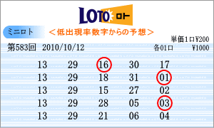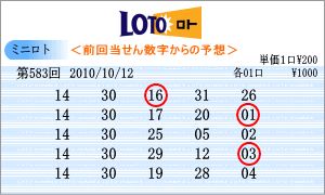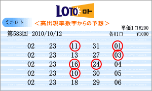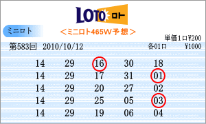 | 10月12日の運命数は「9」と「4」です。「09」・「19」・「29」・「04」・「14」・「24」が対象数字です。582回の結果をチャートに書き込んで見ると、「01」・「02」・「03」と斜めに並びました。ここから「03」・「04」、「14」・「15」、「22」・「29」・「30」などが今回の注意数字です。この中から583回を狙う軸数字は「14」と「29」としました。 |