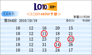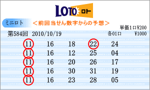 | 10月19日の運命数は、「2」と「5」です。「02」・「12」・「22」・「05」・「15」・「25」が対象数字です。チャートを見ると、「01」・「03」・「10」・「11」・「16」と前回の本数字がきれいな斜線で結ばれています。左右をチェックすると、「12」・「15」・「17」なども候補です。この中から今回の軸は、「10」と「12」を選択しました。 |