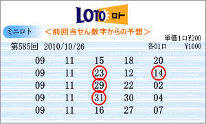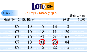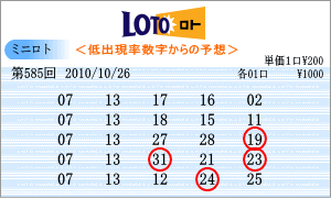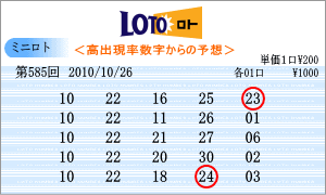 | 10月26日の運命数は、「7」と「6」です。対象数字は、「07」・「17」・「27」・「06」・「16」・「26」の6つの数字です。チャートはきれいな斜線で交差しています。「07」・「09」・「10」・「11」・「13」・「14」などが注意数字です。この中から585回を狙う軸数字は「07」と「10」としました。運命数をチャートにあてはめて見るという逆転の発想で出現数字をチェックするのも一つです。 |