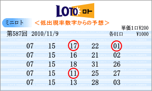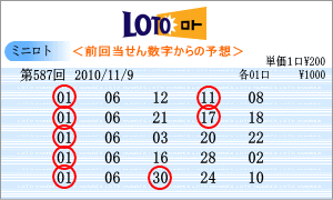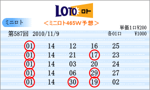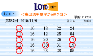 | 11月9日の運命数は、「1」と「4」です。「01」・「11」・「21」・「31」・「04」・「14」・「24」が該当数字です。本数字を入れたチャートを見ると、「15」までの数字が多くなってしまいます。「01」・「06」・「07」・「11」・「12」・「31」が今回の注意数字です。チャートの斜線をチェックし、軸数字は「01」と「14」としました。 |