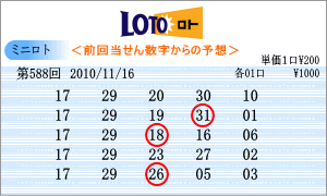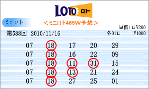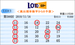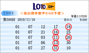 | 11月16日の運命数は、「7」と「8」です。「07」・「17」・「27」・「08」・「18」・「28」が該当数字です。出現チャートからの注意数字は、「01」・「07」・「11」・「16」・「17」・「18」・「19」・「20」・「29」とでました。この中から588回を狙う軸数字は、「07」と「18」としました。「07」はワースト数字2位、「18」は直近30回で8回と3位の数字です。 |