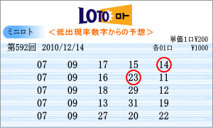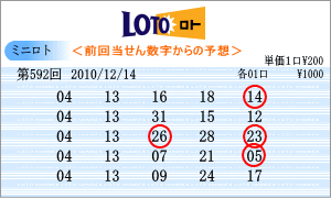 | 12月14日の運命数は「1」と「4」です。該当数字は、「01」・「11」・「21」・「31」・「04」・「14」・「24」です。3回連続がかかる「04」がはいっています。出現チャートからの注意数字は、「04」・「05」・「08」・「09」・「11」・「13」・「20」です。592回を狙う軸数字は、「04」と「11」を選びました。「11」はベスト数字1位の数字です。 |
