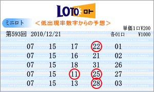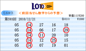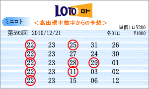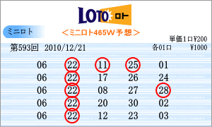 | 12月21日の運命数は「2」と「6」です。該当数字は「02」・「12」・「22」・「06」・「16」・「26」の6つです。チャートからの注意数字は、「05」・「06」・「15」・「23」・「24」・「25」・「26」などです。第593回を狙う軸数字は、運命数とかさなった「06」と注意数字「23」の隣の「22」を選びました。 |