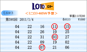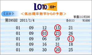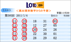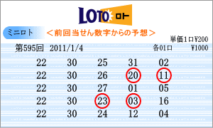| 2011年の最初の抽せん回を狙う出現予測範囲は「01」・「02」・「04」・「05」・「09」・「10」・「11」・「21」・「22」・「23」・「29」・「30」・「31」となりました。連続候補は、「22」と「30」を軸数字としました。高確率はベスト数字1位の「11」と4位の「23」を軸に。低確率は、ワースト1位の「09」と3位の「01」を軸にしました。 |