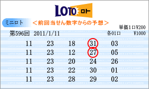 | 1月11日の運命数は、「3」・「7」・「2」の3つ。該当する数字は、「03」・「13」・「23」・「07」・「17」・「27」・02」・「12」・「22」の9つです。チャートからの注意数字は、「11」・「12」・「15」・「20」・「22」・「23」などが斜線が交差しています。この中から、596回を狙う軸数字は「03」と「22」を選びました。 |