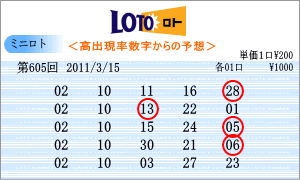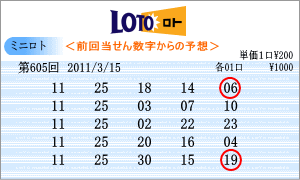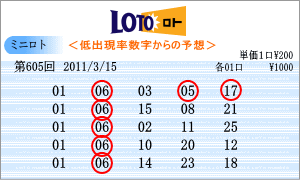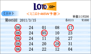 | 3月15日の運命数は、「5」・「1」・「4」です。数字的には、「05」・「15」・「25」・「01」・「11」・「21」・「31」・「04」・「14」・「24」です。出現チャートからは、「03」・「06」・「11」・「13」・「24」・「25」が注意数字です。この中から「06」と「24」を軸数字としました。 |