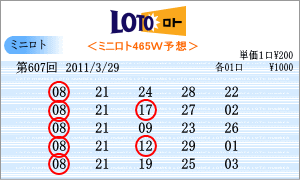 | 3月29日の運命数は、「1」と「4」です。「01」・「11」・「21」・「31」・「04」・「14」・「24」が対象数字です。チャートからの注意数字は、「08」・「09」・「10」・「20」・「21」・「22」・「30」などです。チャートから、ここに出現すると斜線が完成すると思われる「08」と「21」を軸数字としました。 |
