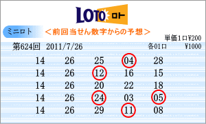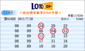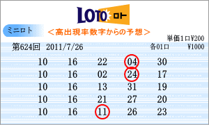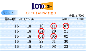 | 7月26日の運命数は「6」と「8」。該当する数字は、「06」・「16」・「26」・「08」・「18」・「28」の6つ。出現チャートからの注意数字は、「09」・「14」・「15」・「26」・「27」・「30」。これらの数字から、今回の軸数字は「16」と「18」を選びました。 |