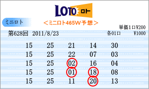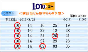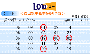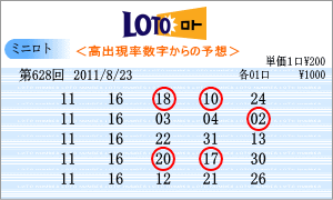 | 第628回の予測範囲は、「05」・「06」・「09」・「10」・「13」・「14」・「15」・「16」・「19」・「20」となりました。627回からの連続候補は、「10」・「14」・「15」と3つでたのですが、「10」と「14」を軸数字としました。高確率は、ベスト数字1・2位の「11」と「16」。低確率は、ワースト数字1位の「09」と5位の「06」を軸数字としました。 |