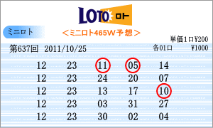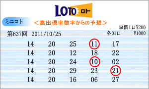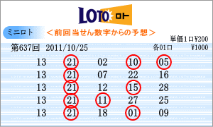| 10月25日の運命数は、「2」と「3」の2つ。該当する数字は、「02」・「12」・「22」・「03」・「13」・「23」の6つの数字です。出現チャートからの注意数字は、「08」・「09」・「14」・「21」・「22」でしょうか。636回の本数字をベースに斜線をチェックすると「26」を除いて、どの数字もきれいな斜線になっています。軸は「12」と「23」を選びました。 |
