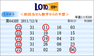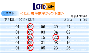| 12月6日の予測範囲は、「01」・「08」・「09」・「10」・「21」・「22」・「23」・「25」・「26」・「27」・「28」・「30」・「31」となりました。連続候補は、「22」と「31」を軸数字に。高確率はベスト数字の上位がありませんので、出現回数の多い「25」と「30」を軸数字としました。低確率は、ワースト数字1位の「09」と3位の「01」を軸数字としました。 |