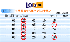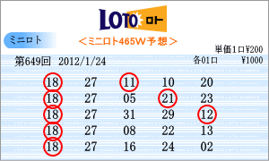 | 1月24日の運命数は「7」と「8」です。前回の結果を書き込んだチャートを見ると、「06」、「21」、ボーナス数字の「26」が斜線が交差しています。「07」、「25」、「27」など注意数字を見比べると、「06」の4連続も可能性ありと感じます。ただ、運命数に「06」がないので軸数字としては選べませんでした。今回は、「18」と「27」を軸数字としました。 |