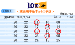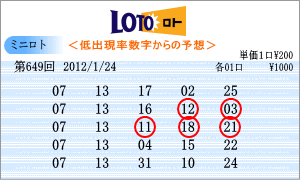 | 1月24日の予測範囲は、「05」・「06」・「07」・「12」・「13」・「18」・「19」・「20」・「21」・「22」・「25」・「26」・「27」です。連続候補は「06」と「21」を軸数字としました。4回連続はそうそうないのですが、どうなりますか。「06」の替わりに「26」も考えました。高確率は、ベスト数字4位の「20」、5位の「22」を軸に。低確率は、ワースト数字2位の「07」、6位の「13」を軸数字としました。 |