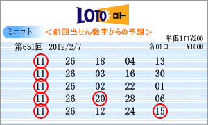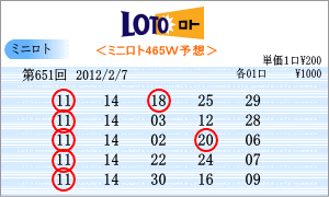 | 2月7日の運命数は、「1」と「4」です。650回の本数字を書き込みチャートをみると、5つの数字が全部斜線が交差しています。「01」・「11」・「21」・「31」・「04」・「14」・「24」をチェックすると、「11」・「21」・「14」・「24」が候補でしょうか。この中から「11」と「14」を軸数字として選びました。「11」は3連続出現がかかっています。 |