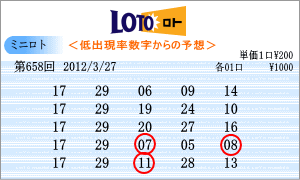 | 3月27日の予測範囲は、「08」・「09」・「10」・「11」・「13」・「14」・「15」・「17」・「18」・「19」・「22」・「23」・「24」・「29」・「30」・「31」となりました。連続候補は、「09」と3連続がかかる「23」を軸数字としました。高確率は、ベスト数字1位の「11」と7回出現の「18」を軸に。低確率は、ワースト数字4位の「29」と未出現の「17」を軸数字としました。5口の買い目は、「ミニロトパーフェクトデータ VOL3」から組み立ててました。 |