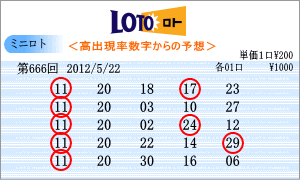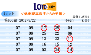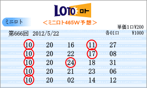 | 5月22日は666回となんか気になる数字の回数です。その666回の運命数は、「1」・「7」・「0」の3つ。「01」・「11」・「21」・「31」・「07」・「17」・「27」・「10」・「20」・「30」が該当します。出現チャートでチェックすると、「10」、「11」、「20」、「21」、「07」などが候補としてあがってきます。出現回数から見ると7回出現の「07」・「11」が多いですが、その中から「10」と「20」を軸数字としました。 |