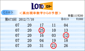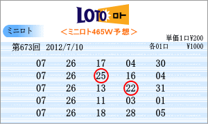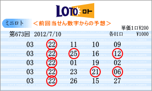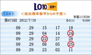 | 7月10日の運命数は、「6」と「7」です。「06」・「16」・「26」・「07」・「17」・「27」が該当数字です。出現チャートからの注意数字は、「06」・「07」・「08」・「09」・「21」・「29」など。ここから、673回ミニロトを狙う軸数字は「07」と「26」を選びました。 |