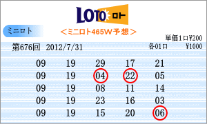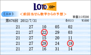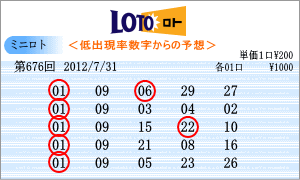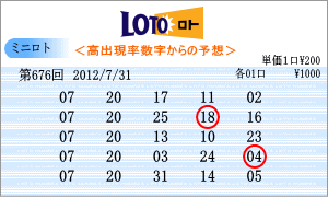 | 7月31日の運命数は、「9」と「8」です。「09」・「19」・「29」・「08」・「18」・「28」と6つの数字が該当します。チャートからの注意数字は、「07」・「09」・「19」・「21」・「27」・「28」・「31」など。これらから、676回の軸数字は、「09」と「19」としました。「18」、「28」、また「24」も検討しました。 |