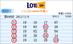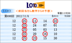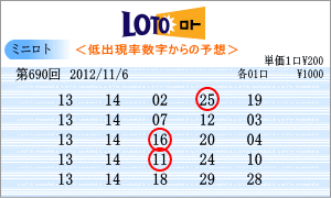 | 11月6日の予測範囲は、「06」・「07」・「11」・「12」・「13」・「14」・「19」・「20」・「22」・「23」・「24」・「25」・「26」となりました。連続数字候補は、「12」と「25」を軸数字に。高確率は、13回出現の「07」と「11」を軸に。低確率は、4回出現の「13」と「14」を軸数字としました。20番台の数字が1つだけですが、軸に入ってきました。 |